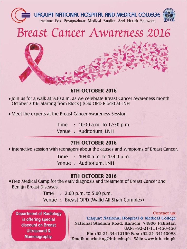 {Awareness} LNH - Breast Cancer Awareness Programmes, 6-8 October, 2016 at Liaquat National Hospital & Medical College